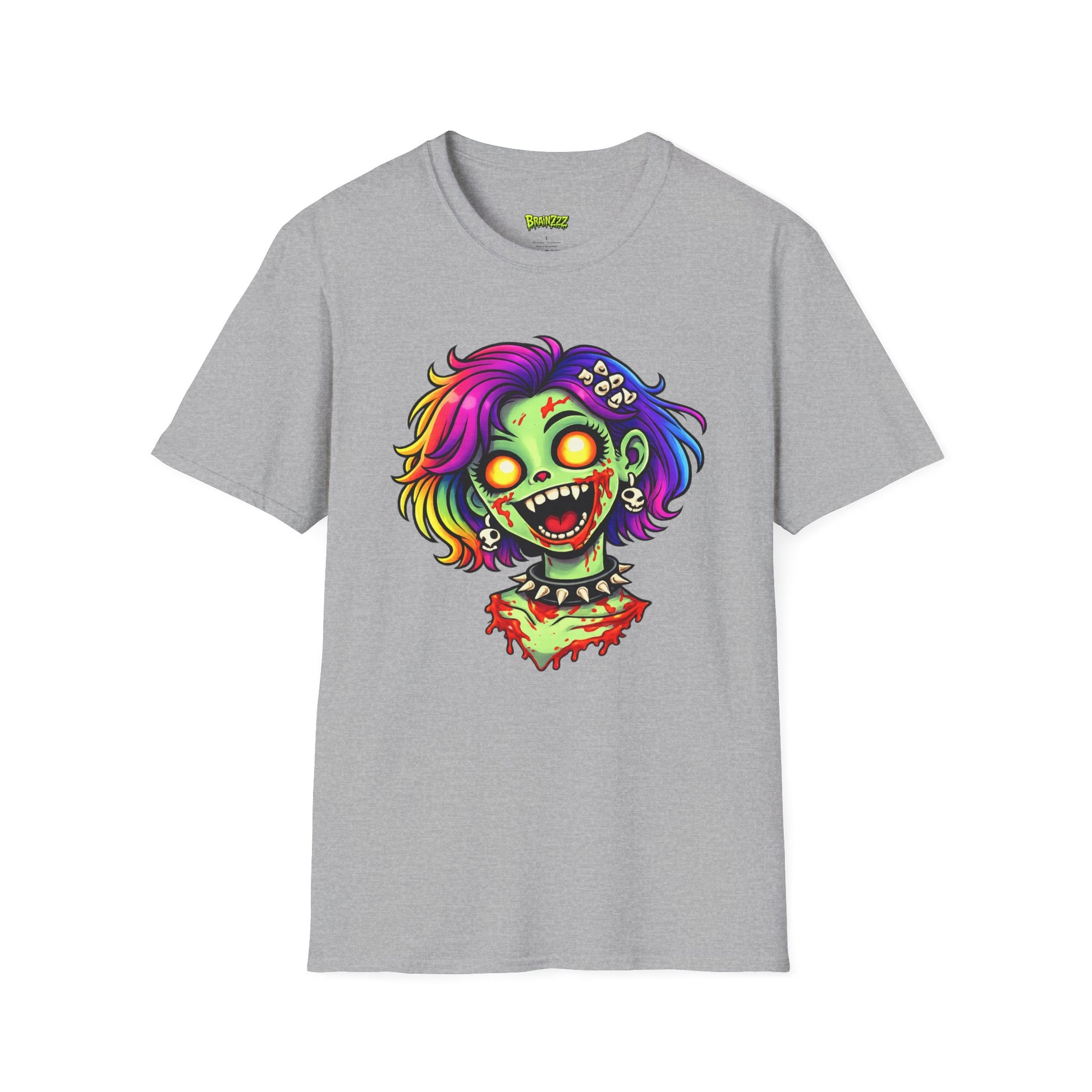 Bright, edgy, and proudly weird — this lightweight tee wears attitude like armor. The front features a neon zombie-punk illustration: wide, glowing eyes, a toothy grin, and rainbow-streaked hair with tiny skull accents. It reads like a slice of underground comic art that refuses to fade. Soft, breathable cotton keeps the print vibrant while you wear it to shows, midnight skate sessions, or late-night hangouts. Short, bold sentences. Loud colors. Quiet confidence — for people who like to stand out without saying too much.